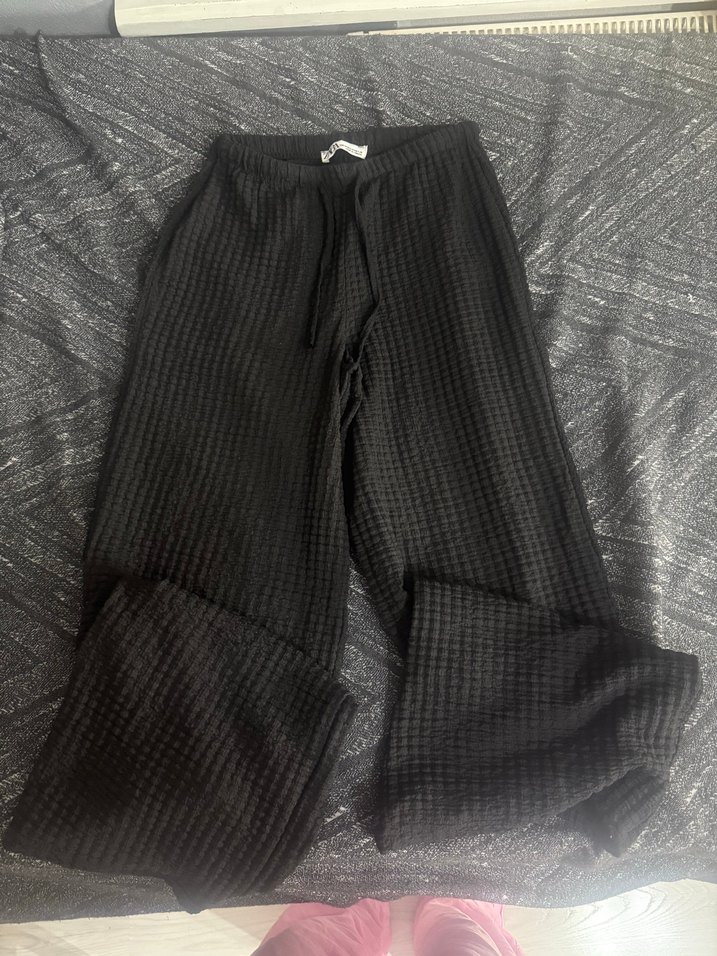 Yumuşak sentetik kumaştan yapılmış, pilili detaylara sahip siyah, bol kesim pantolon. Günlük rahat kullanım için uygundur.
