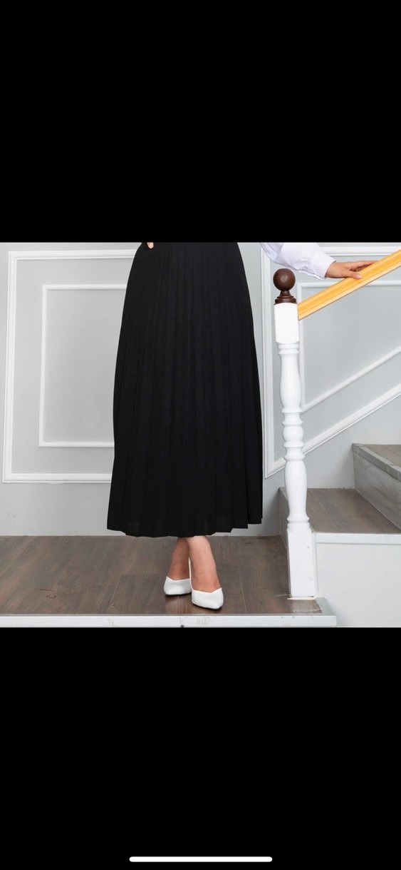 Siyah renk, uzun boy, pilili ve regular fit kesime sahip kadın eteği. Kalın Sentetik kumaştan, klasik ve minimalist tarz için uygundur. Hiç giymedim kemer kısmı durmaktan biraz rengi koyulaşmış onun dışında tertemiz