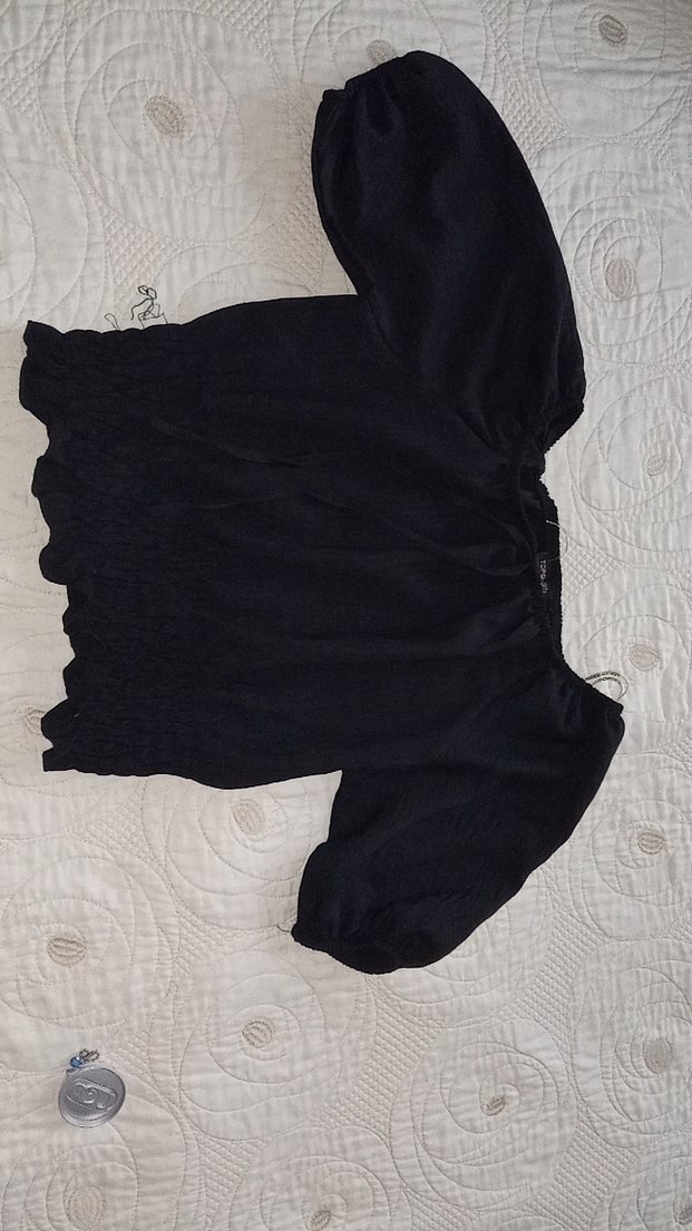 Siyah keten kumaştan, pilili detaylı, kısa kollu ve tekne yaka, midi boyda bol kesim kadın bluz. Günlük kullanıma uygun sade gotik tarzda. ufak bı ip söküğü var ama çok rahatsiz edici degil