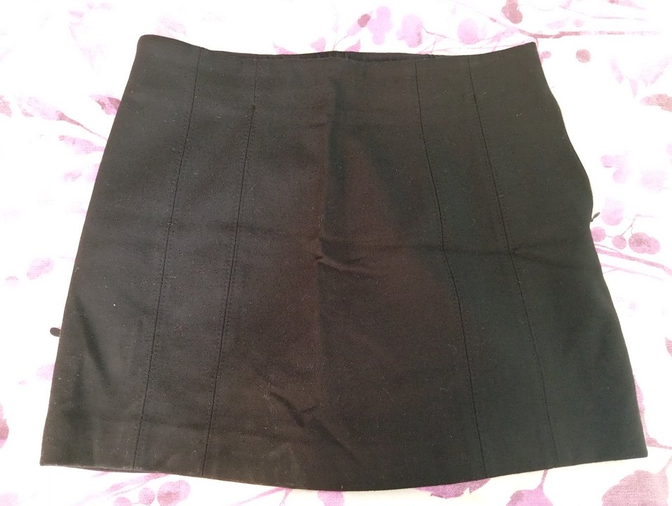 Parlak siyah renkte, pilili ve normal boyda, ofis için uygun, minimalist gotik tarzda, vücuda oturan hamile eteği.