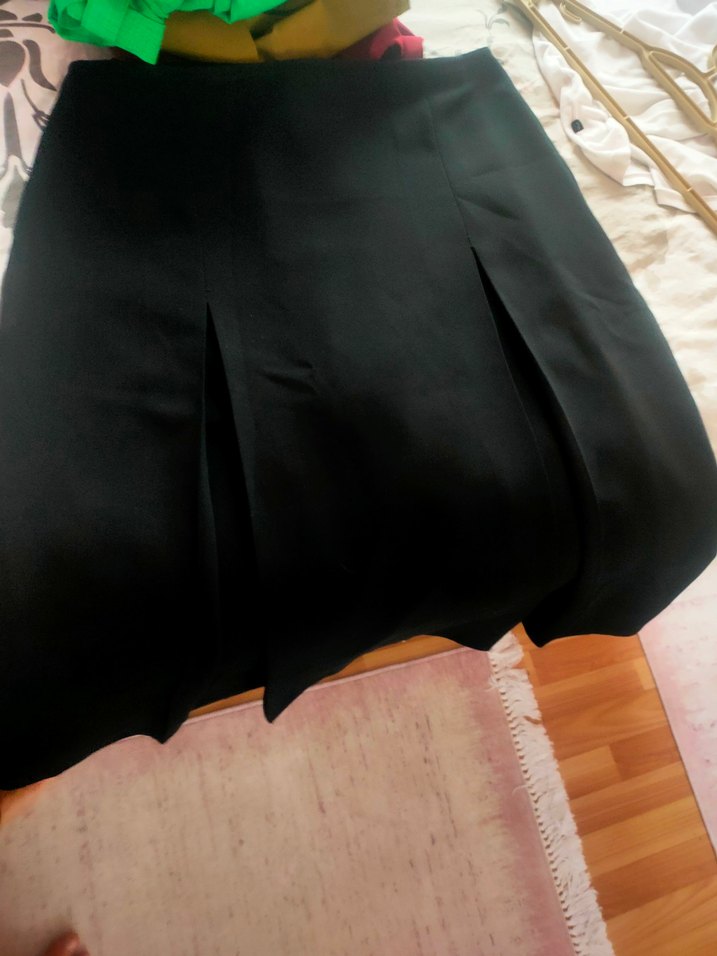 Siyah, pilili ve ipeksi normal boyda ve bu etek, ofis için gotik ve Paris tarzı şıklık sunar.