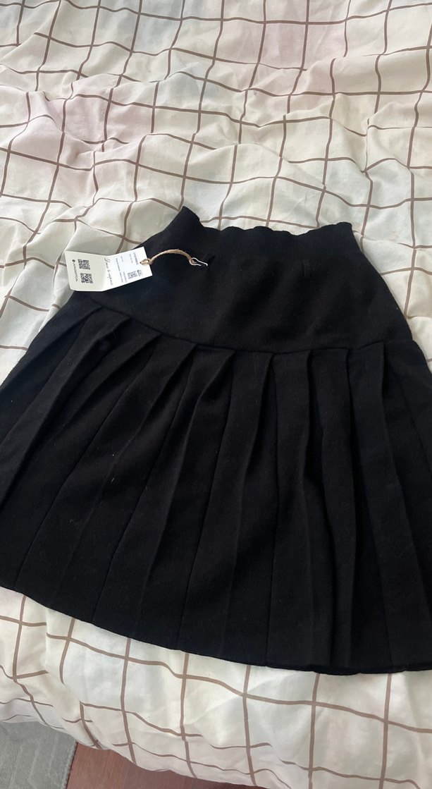 Siyah renkte, sentetik kumaştan, pilili ve bol kesim midi etek. Minimalist goth tarzıyla günlük kullanım için uygundur.