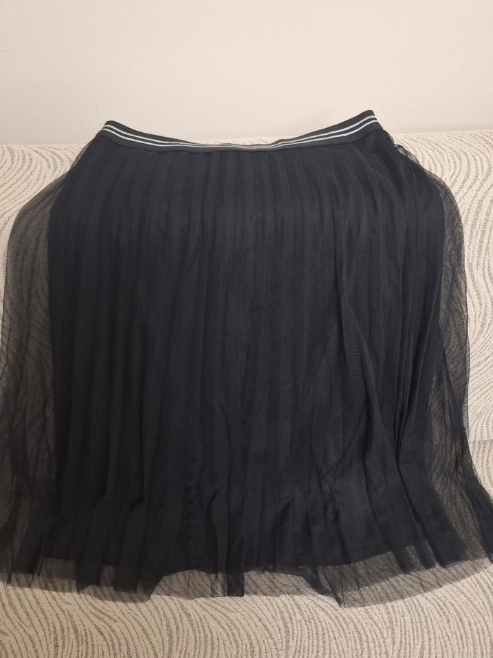 Siyah renkte, sentetik kumaştan üretilmiş pilili midi etek. Gevşek kesimi ve gotik Paris tarzıyla dış mekan kullanımı için uygun.