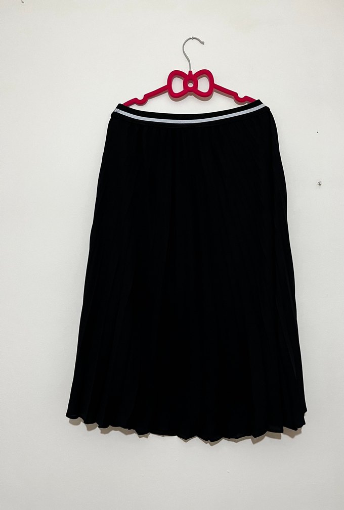 Siyah pilili midi eteği, rahat kesimli ve yumuşak sıcak bir kumaşa sahiptir. Çizgili bel bandı ile gotik ve Paris tarzını birleştirir.