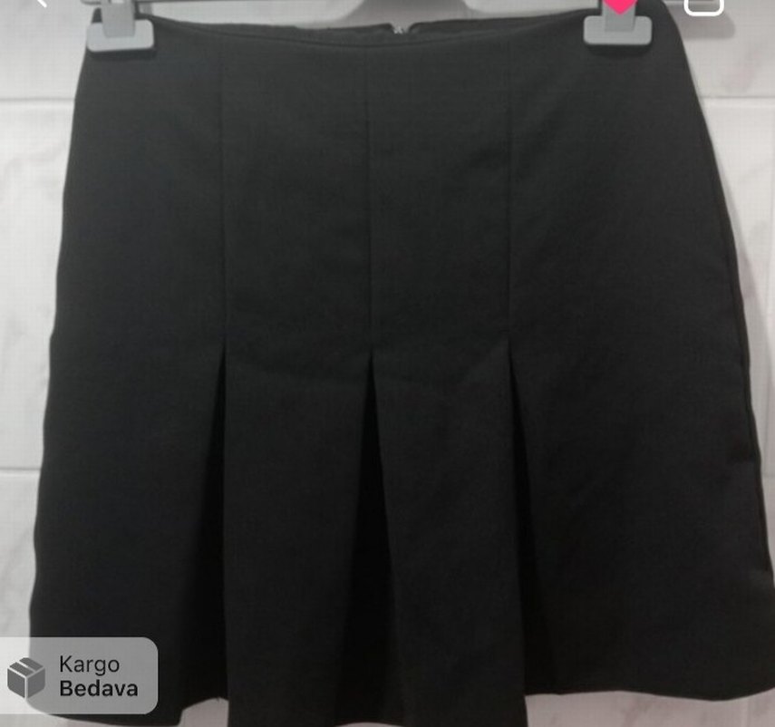 Siyah pilili midi etek, sentetik kumaştan, düz ve desen içermeyen tasarıma sahip. Ofis için uygun gotik tarzda, normal kesimdir.