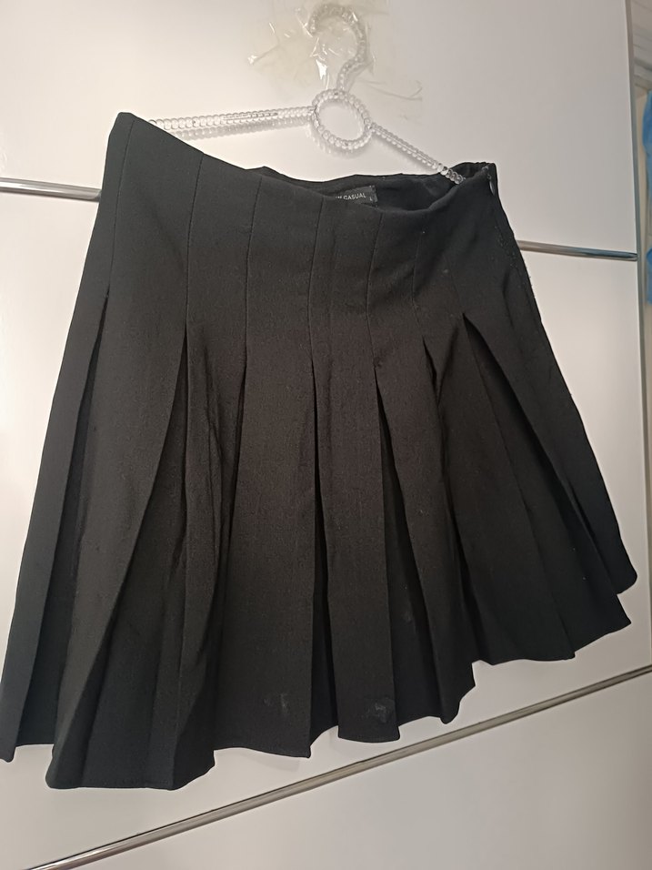 Bu siyah mini etek, pilili ve midi boyda olup, vücuda oturan kesimi ve sentetik kumaşıyla gotik tarzda şık bir ofis kıyafetidir.
