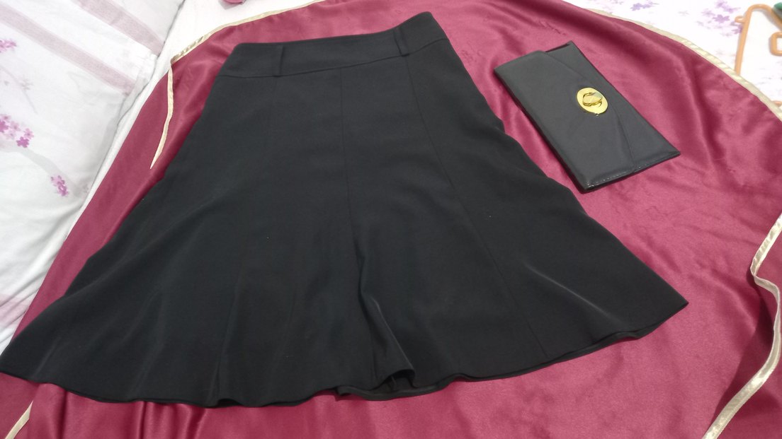 Siyah renkte, pilili ve midi boyda, düz ve şık tasarımlı, hamileler için ince kesim ve ipeksi dokulu etek. Ofis için uygundur.