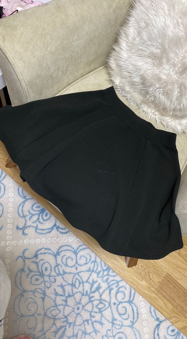 Siyah renkte, sentetik kumaştan pilili ve bol kesim midi etek. Düz ve desen içermeyen tasarımıyla ofis kullanımı için uygundur.