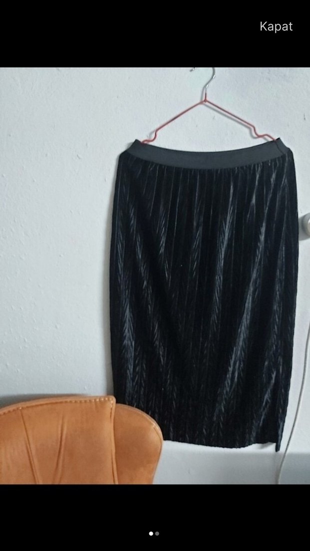 Siyah, pilili ve vücuda oturan midi etek, sentetik kumaştan üretilmiş, minimalist ve gotik tarzda günlük kullanıma uygundur.