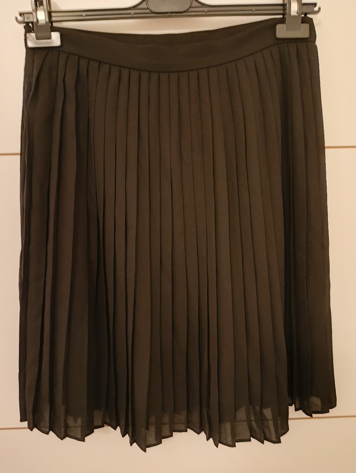 siyah renkli, pilili ve midi boyda, bol kesim kadın eteği. Yumuşak sentetik kumaştan, ofis için uygun goth ve avangard tarzda. yandan fermuarlı 38 beden