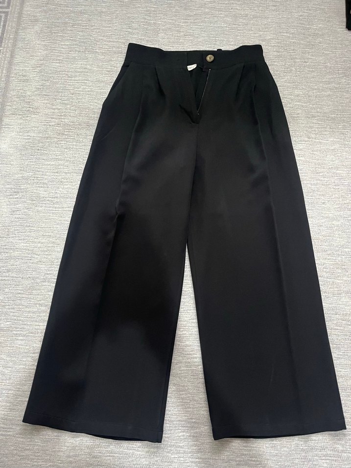 Siyah, midi boy, pilili ve ipeksi dokulu kumaş pantolon. Normal kesim, normcore tarzıyla ofis kullanımı için uygun.