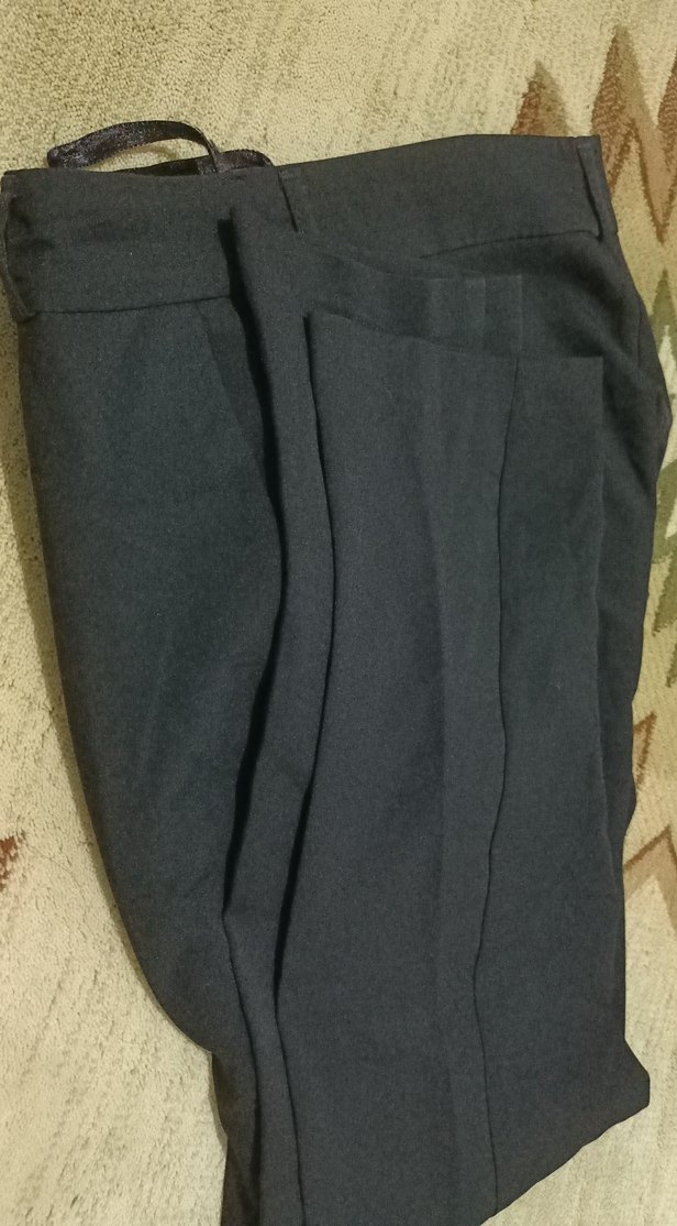 siyah renkte, pilili ve midi boyda kadın kumaş pantolon. Normal kesim ve sentetik kumaştan, iş ortamı için uygun sade bir model.