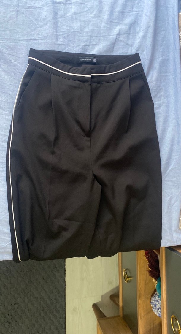 Kadınlar için siyah pilili midi kumaş pantolon, regular fit ve beyaz yan şerit detaylı. Ofis ve günlük kullanıma uygun.