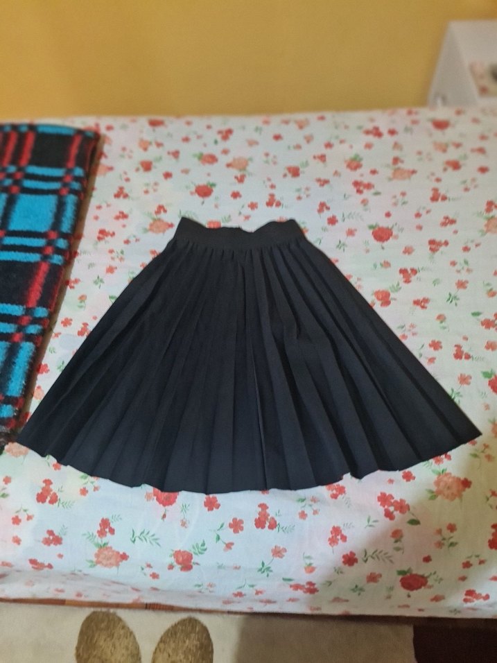 Siyah renkli, sentetik kumaştan yapılmış pilili midi uzunlukta, bol kesim kadın mini etek. Gotik tarzı yansıtır.