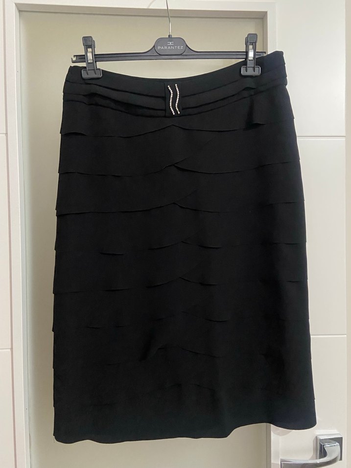 Sentetik kumaştan yapılmış, pilili katmanlara sahip siyah, vücuda oturan midi kalem etek. Belde ince bir süs detayı bulunur, iş ortamına uygundur. Bir kez kullanıldı yeni gibi