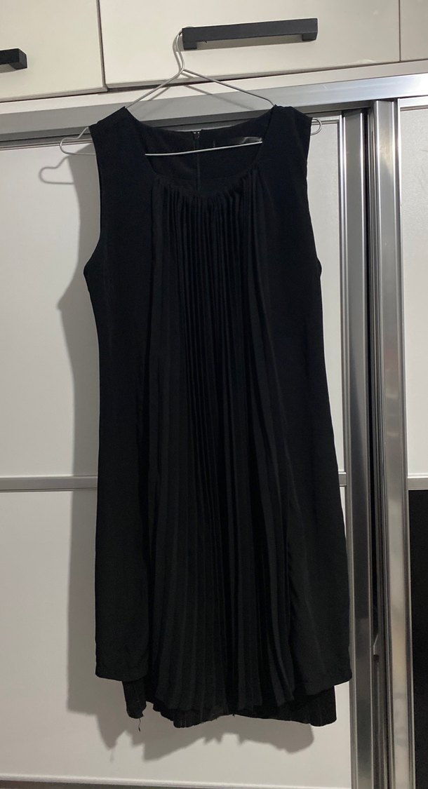 Siyah, kolsuz midi elbise, yüksek yakalı ve önünde pilili detaylı. Gevşek kesimli, gotik tarzda, şık ofis kullanımı için uygun.