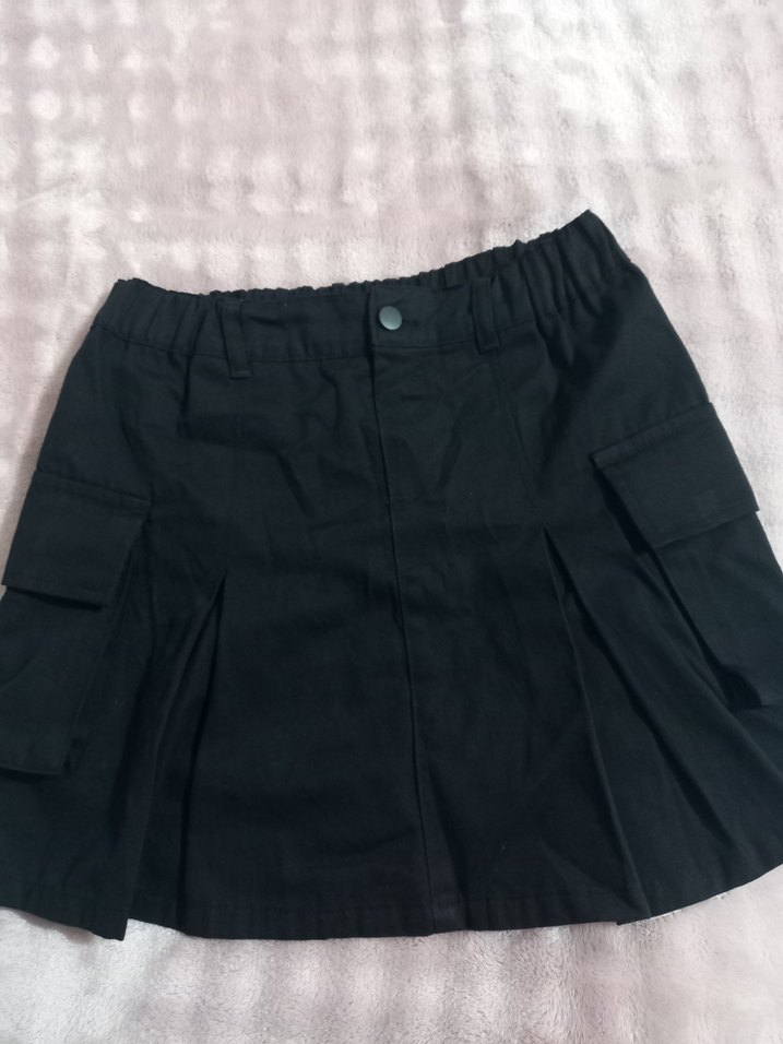 Siyah mini etek, pilili detaylar ve yan ceplerle bol kesimdir. Sentetik kumaştan yapılmış, günlük kullanım için uygundur. Minimalist sokak tarzı için ideal.