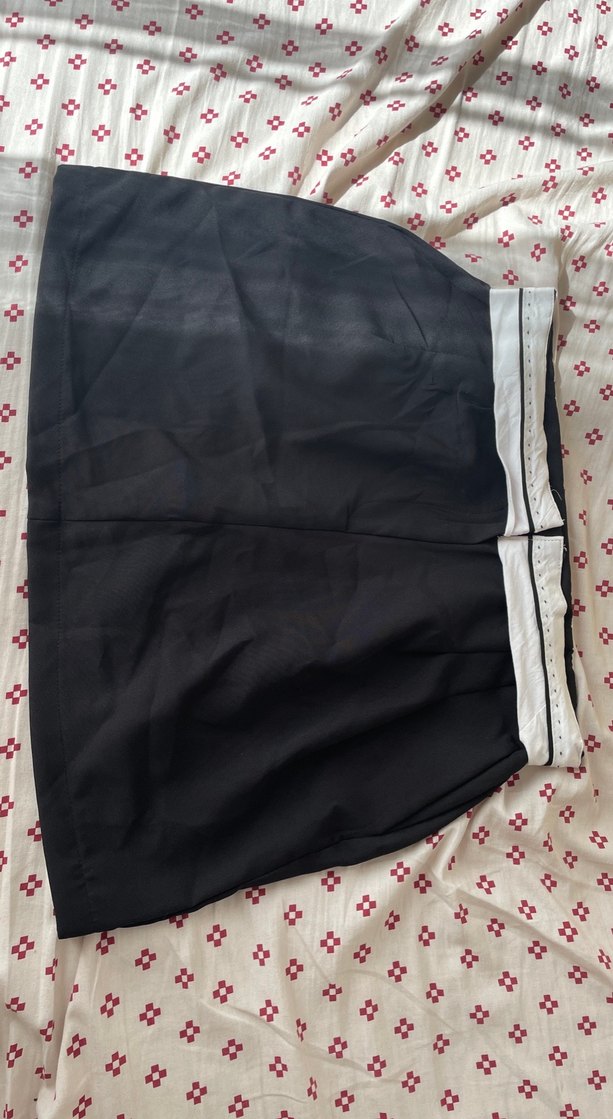 Siyah pilili midi mini etek, beyaz bel bant detaylı, sentetik kumaştan, günlük sokak stili için uygun.