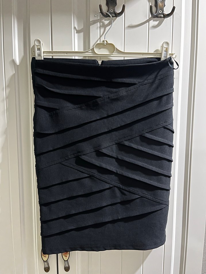 Pilili tasarıma sahip, siyah, fitted midi mini etek. Ofis kullanımı için uygun, gotik ve avant-garde tarzda. Seksi ve hoş bir görüntüsü var.