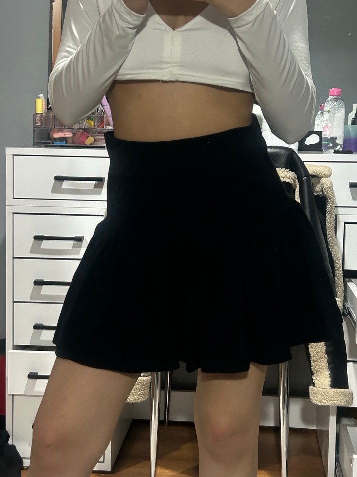 Siyah, pilili ve midi boyda bu mini etek, sentetik kumaştan üretilmiş olup cesur gotik stil için uygundur.