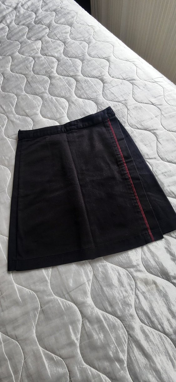 Siyah, pilili ve yanında ince kırmızı çizgi detaylı, düz kesim mini etek. Ofis kullanımı için uygun, sentetik dokulu kumaştan yapılmıştır. şort etektir.