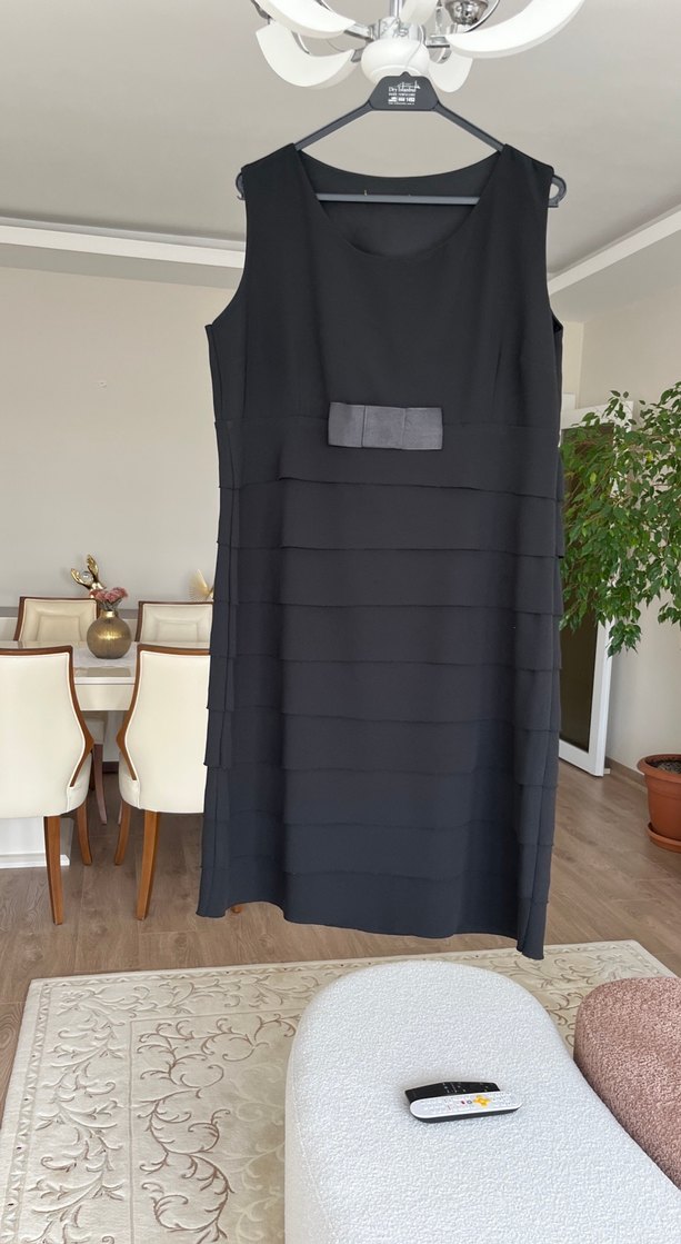 Kolsuz, siyah pilili midi elbise, tek renk ve kayık yaka detaylarıyla ofis için modern ve rahat bir görünüm sunar.