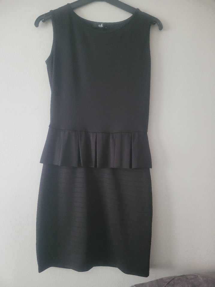 Siyah renk, kolsuz, bisiklet yaka ve belinde pilili detaylı, vücuda oturan midi elbise. Ofis için uygun şık bir model.