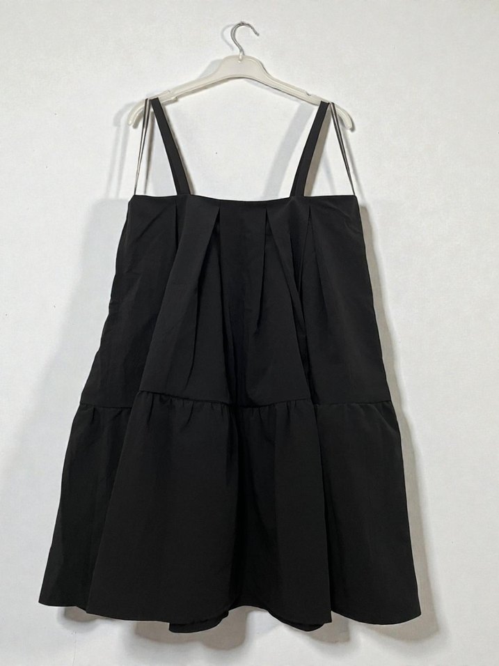 Siyah pilili mini elbise, askılı ve salaş kesimlidir. Sentetik kumaştan yapılmış, askısız yaka ve minimalist tasarıma sahiptir.