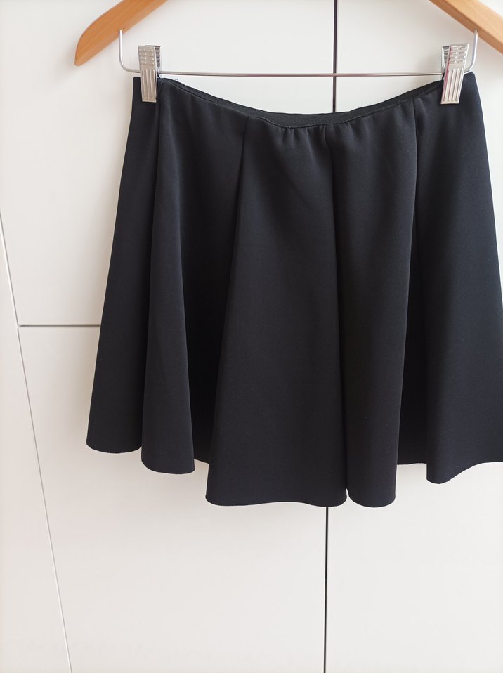 Siyah renkli, pilili ve bol kesim mini etek. Düz, minimalist tarzda, sentetik kumaştan üretilmiştir. Günlük kullanım için uygundur.