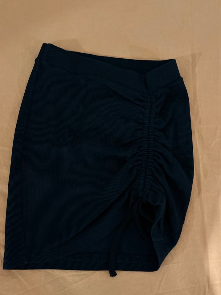 Siyah, dar kesim mini etek, pilili ve yan tarafında büzgülü detaylarla, sentetik kumaştan, sokak stiline uygun.