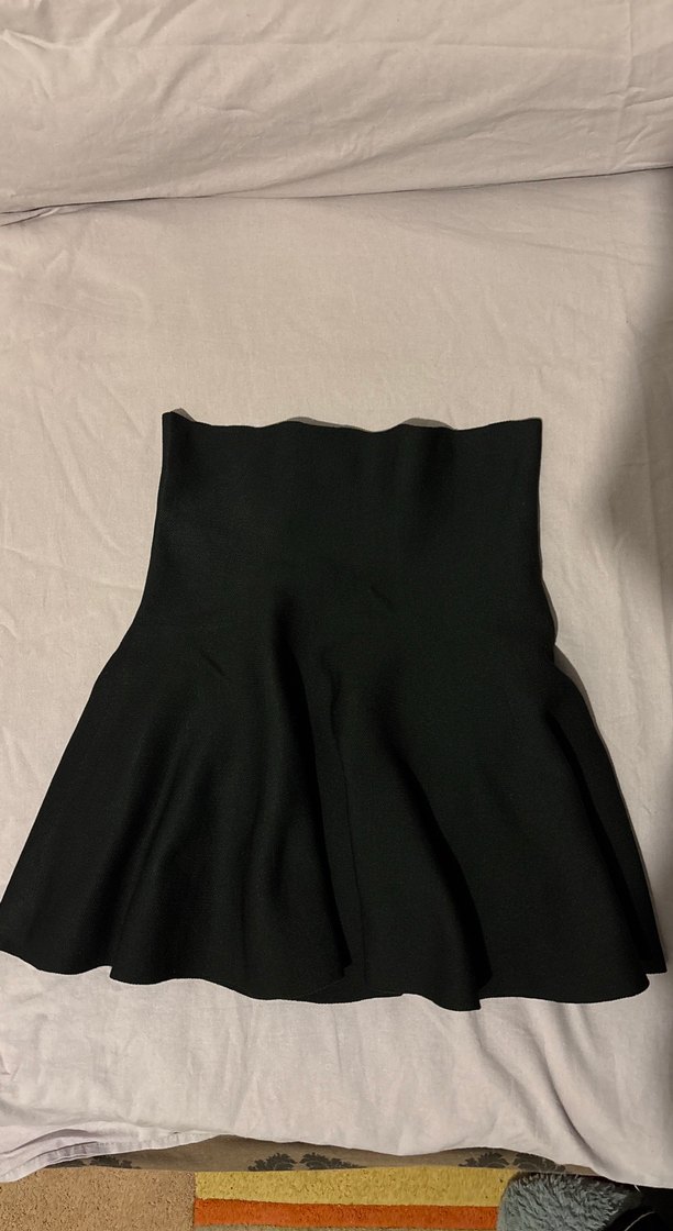 Düz siyah, pilili ve vücuda oturan bu mini etek, yumuşak sentetik kumaştan üretilmiştir. Minimalist gotik tarzı, günlük kullanım için uygundur.