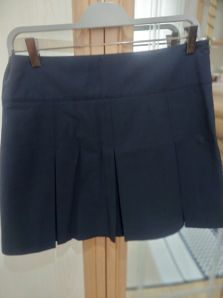 Siyah renkte, pilili ve dar kesim mini etek. Sentetik kumaştan, sade ve minimalist tarzda, ofis kullanımı için uygun.