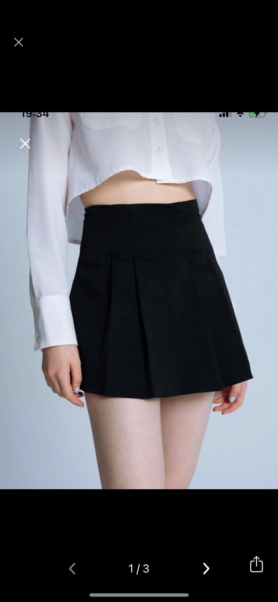 Bu siyah mini etek, pilili ve vücuda oturan tasarımıyla dikkat çeker. Pürüzsüz sentetik kumaştan yapılmış, günlük kullanıma uygundur. Minimalist gotik tarzda şık bir parça.