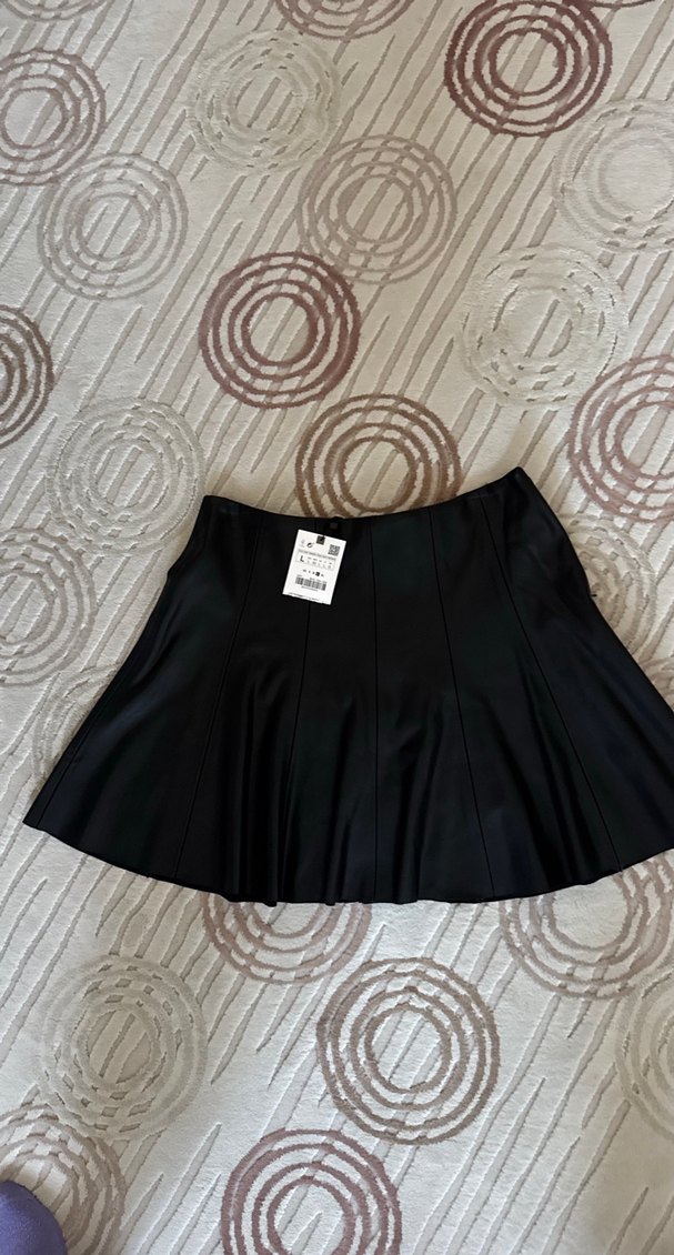 Siyah deri görünümlü kumaştan, pilili mini etek, avangart tarz sunar, dış mekan kullanımı için uygundur. Boyu yaklaşık 43 cm, bel kısmı 40 cm, basen kısmından açılıyor. Basen de yaklaşık 53-54cm.
