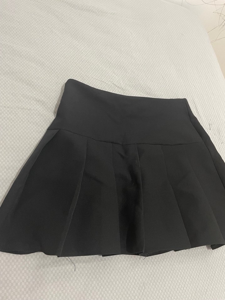 Düz siyah, pilili mini etek. Vücuda oturan kesimi ve sentetik dokusu ile günlük kullanıma uygun minimalist gotik tarzda.