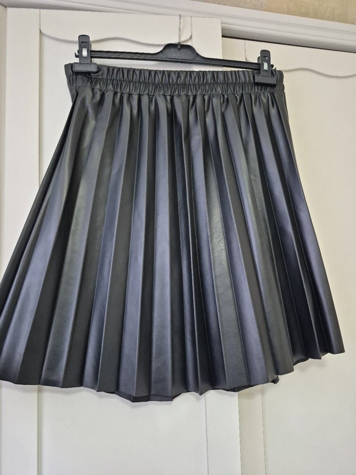 Siyah pilili mini etek, sentetik kumaştan üretilmiş, bol kesim ve gotik tarzda parti için uygundur.