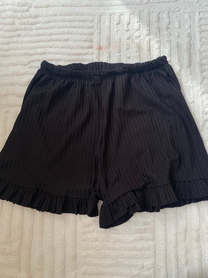 Yumuşak keten kumaştan, bol kesim, pilili siyah hamile şortu. Kısa boy, rahat lastikli bel ve fırfırlı etek ucu ile günlük kullanıma uygun.