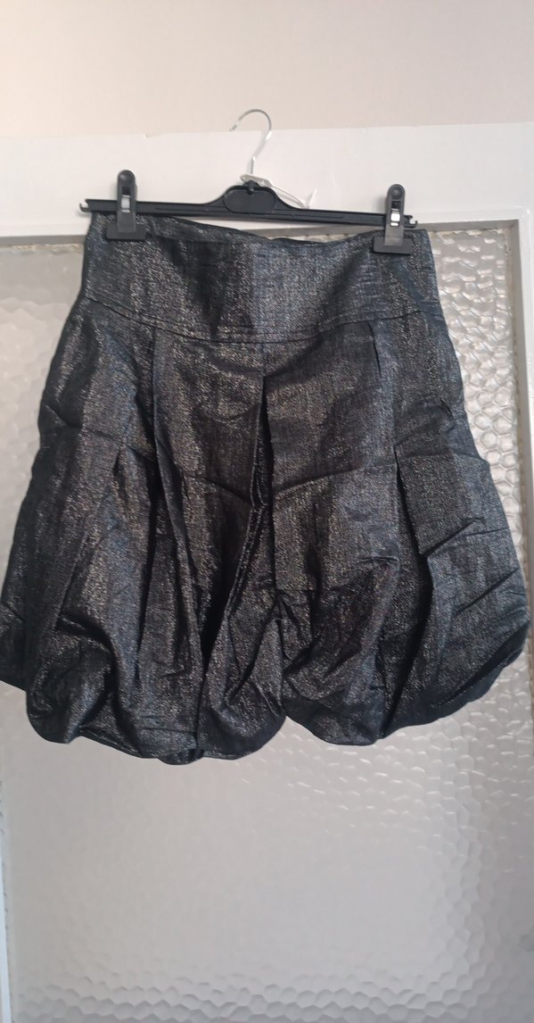 Siyah renkli, keten dokulu, pilili ve bol kesim mini etek. Parti ve sokak stiline uygun. etek balondur askılı straplez üst ve dış cepken bolero tarzında pullu ve simli kumaştan rahat ve şık bir görünüm özel günler için kullanıma uygundur