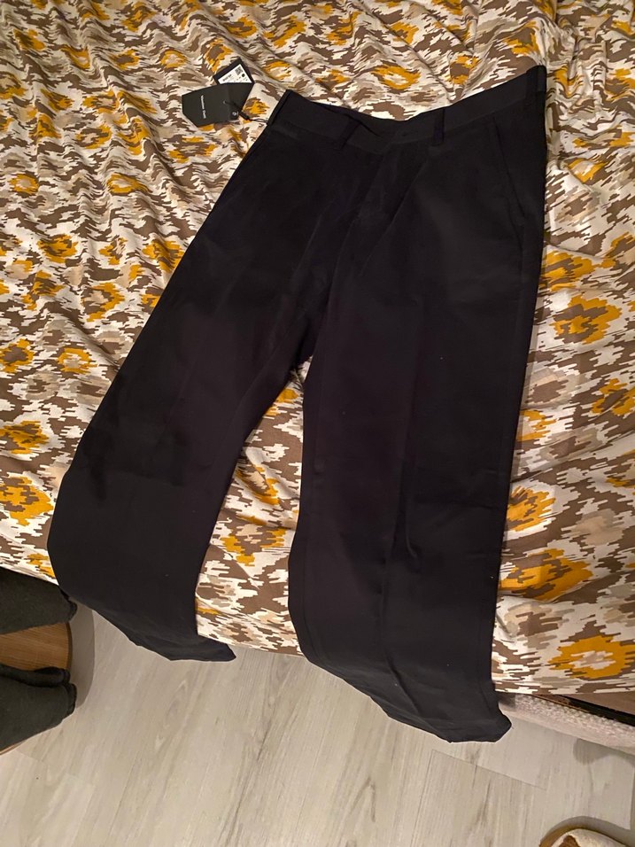 Rahat kesim, pilili siyah kumaş pantolon, midi boy, yumuşak sentetik kumaştan günlük kullanım için uygun.