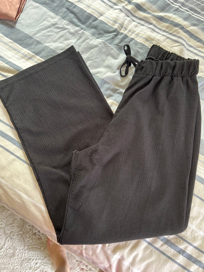 Siyah keten kumaştan, rahat kesim ve pilili pantolon