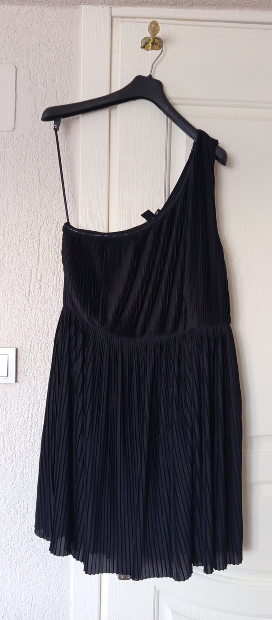 Siyah renkli, straplez yaka ve tek askılı pilili uzun abiye elbisedir. Gevşek kesimiyle gotik tarzda romantik akşamlar için uygundur.