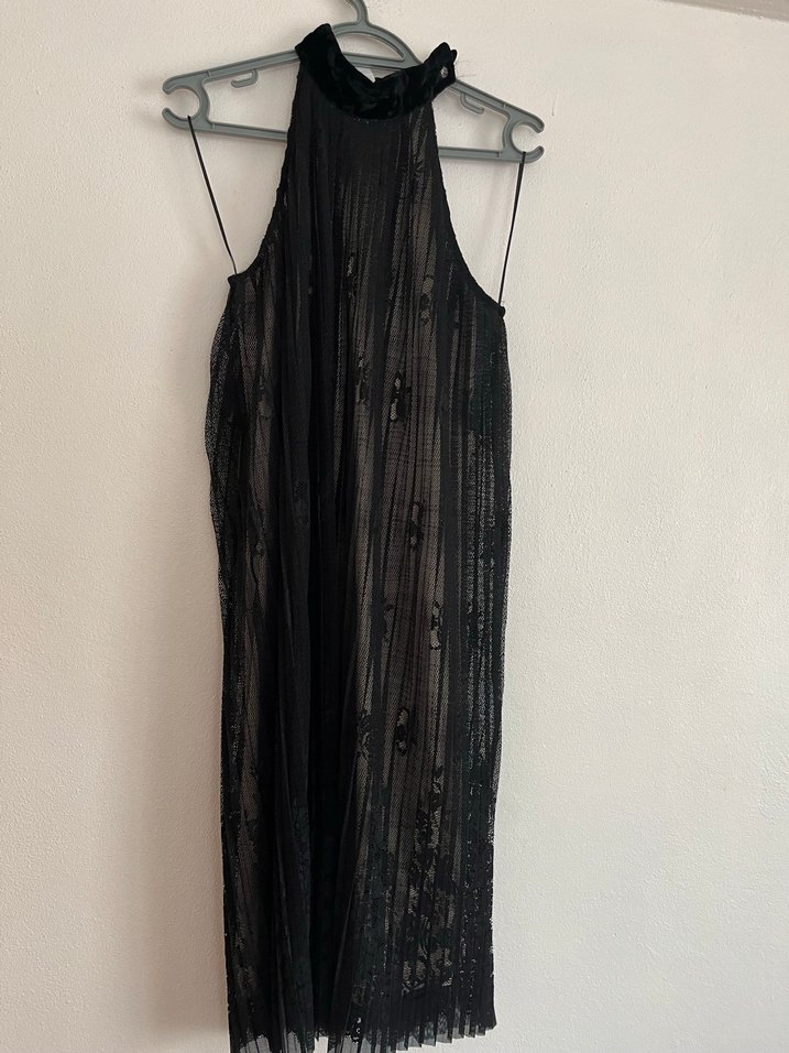 Siyah renkte, pilili, askılı ve halter yakalı uzun boy abiye elbise. Gevşek kesimi ve gotik tarzıyla parti için uygundur.
