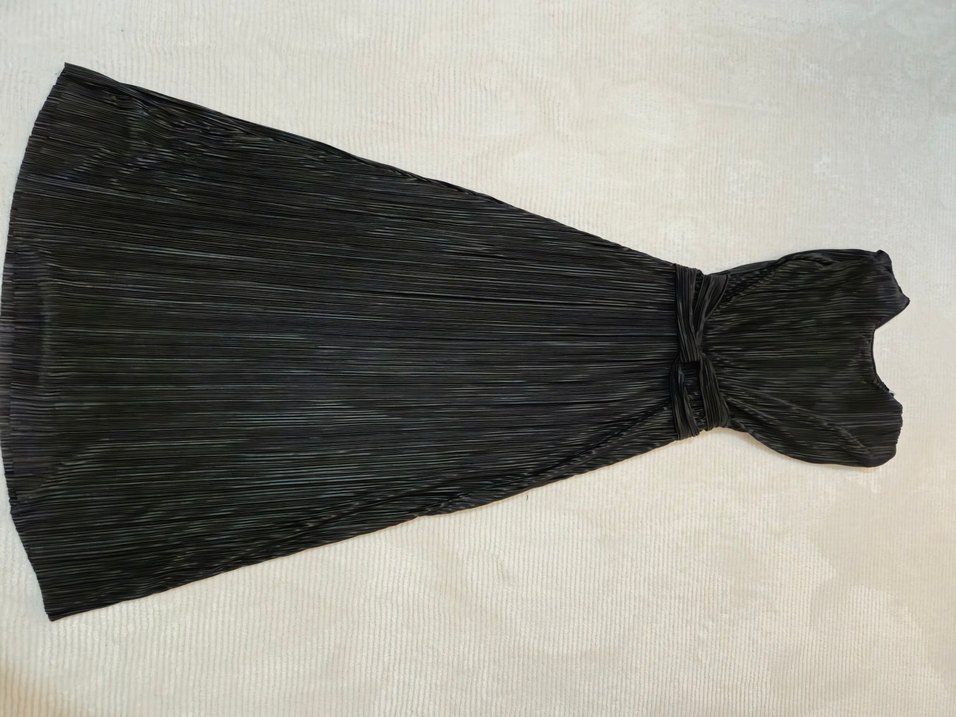 Siyah, pilili, uzun, astarlı,parlak, vatkalı, belinde Kemer detayı var. 1 kere giyildi. içinde astarı var. çok rahat. kumaşı esnek. s beden.