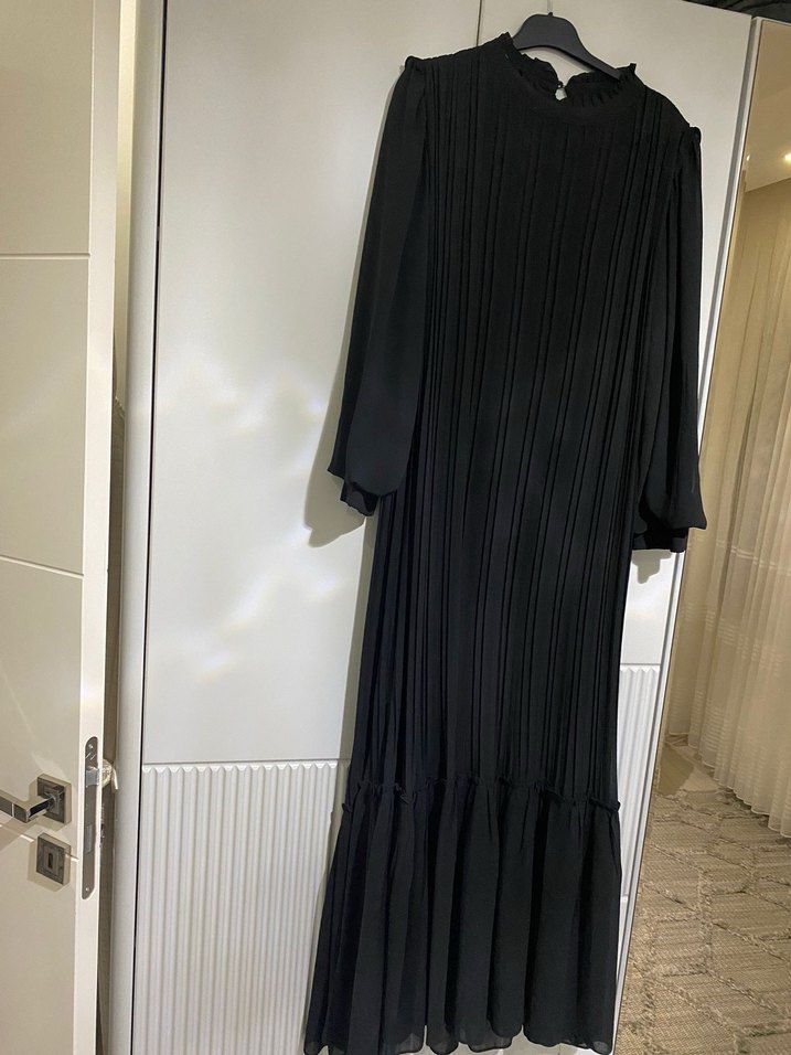 Siyah, pilili uzun elbise, yüksek yakalı ve askılı kollu. Sentetik kumaştan, düzenli kesim ve gotik tarzda klasik şıklık sunar.