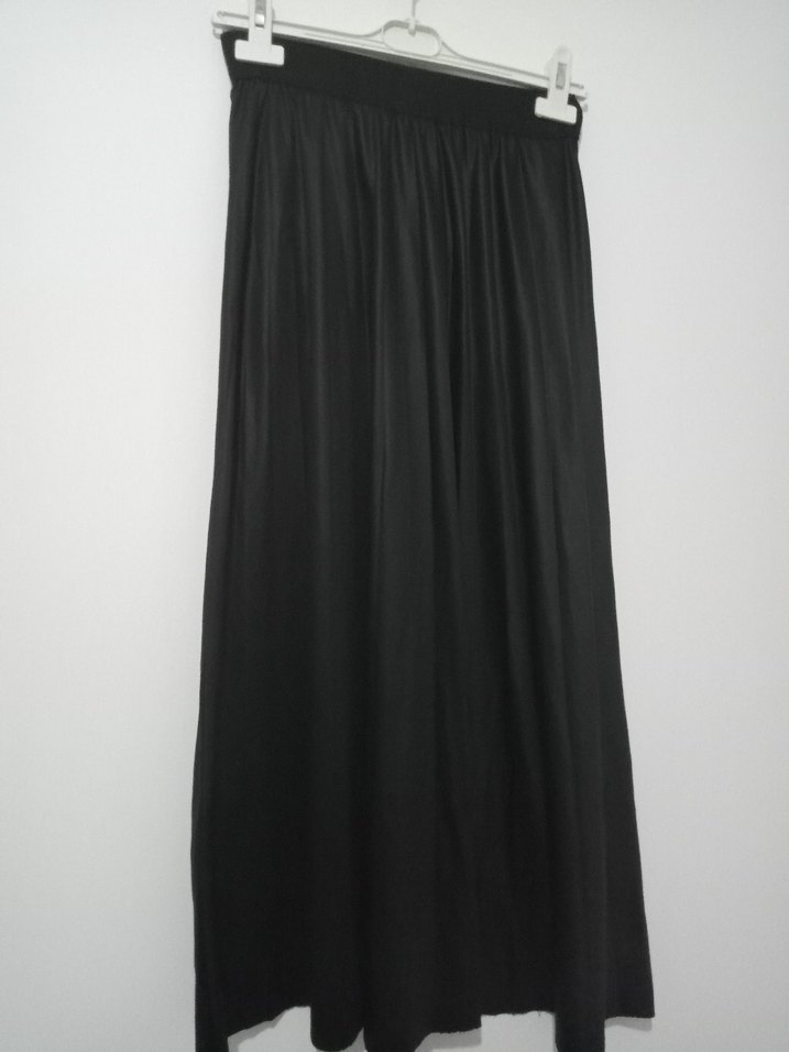 Siyah renkli, pilili ve dökümlü kesime sahip uzun kadın eteği, ipeksi dokusuyla minimalist gotik stile uygundur. Günlük kullanıma uygundur. biraz lastiğinde sıkıntı var ondn uyguna satıyorum