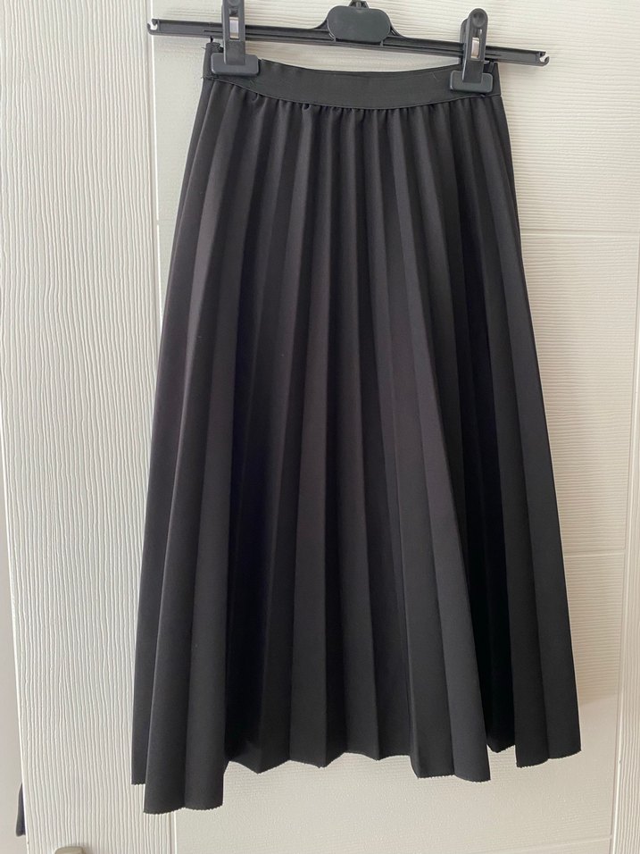 Siyah uzun etek, pilili tasarımı ve düzenli kesimiyle, yumuşak sentetik kumaştan üretilmiştir. Ofis şıklığı için uygun, koyu goth tarzında. Yenidir. Kullanılmadı. Astarı yoktur. Belden ve boydan ölçülerini fotoğraflarda belirttim.