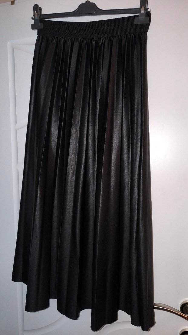 Siyah, pilili ve uzun kesim kadın eteği, yumuşak ve parlak saten dokusuyla gevşek oturur. Gotik ve moda odaklı tarzlar için uygundur.