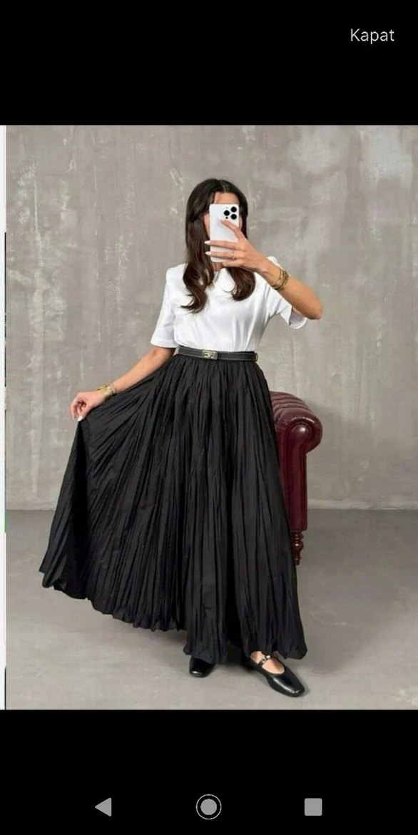 Siyah, pilili ve uzun kesime sahip bu kadın eteği, ipeksi kumaştan üretilmiş ve rahat bir kullanım sunar. standart beden