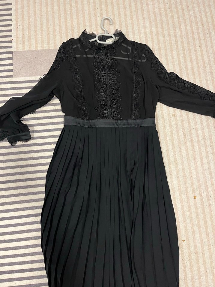Siyah, uzun kollu ve yüksek yakalı, dar kesim gotik elbise. Sentetik kumaştan, pilili etek ve dantel detaylara sahip, klasik şıklık sunar.
