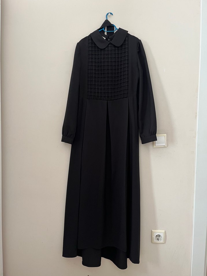Siyah uzun elbise, ön kısmında pilili detaylar ve kesimli yaka bulunur. Sentetik kumaştan, uzun kollu ve düzenli kesim olup, ofiste kullanılan mütevazı gotik tarzda bir modeldir.